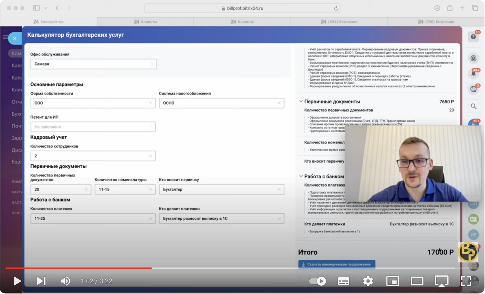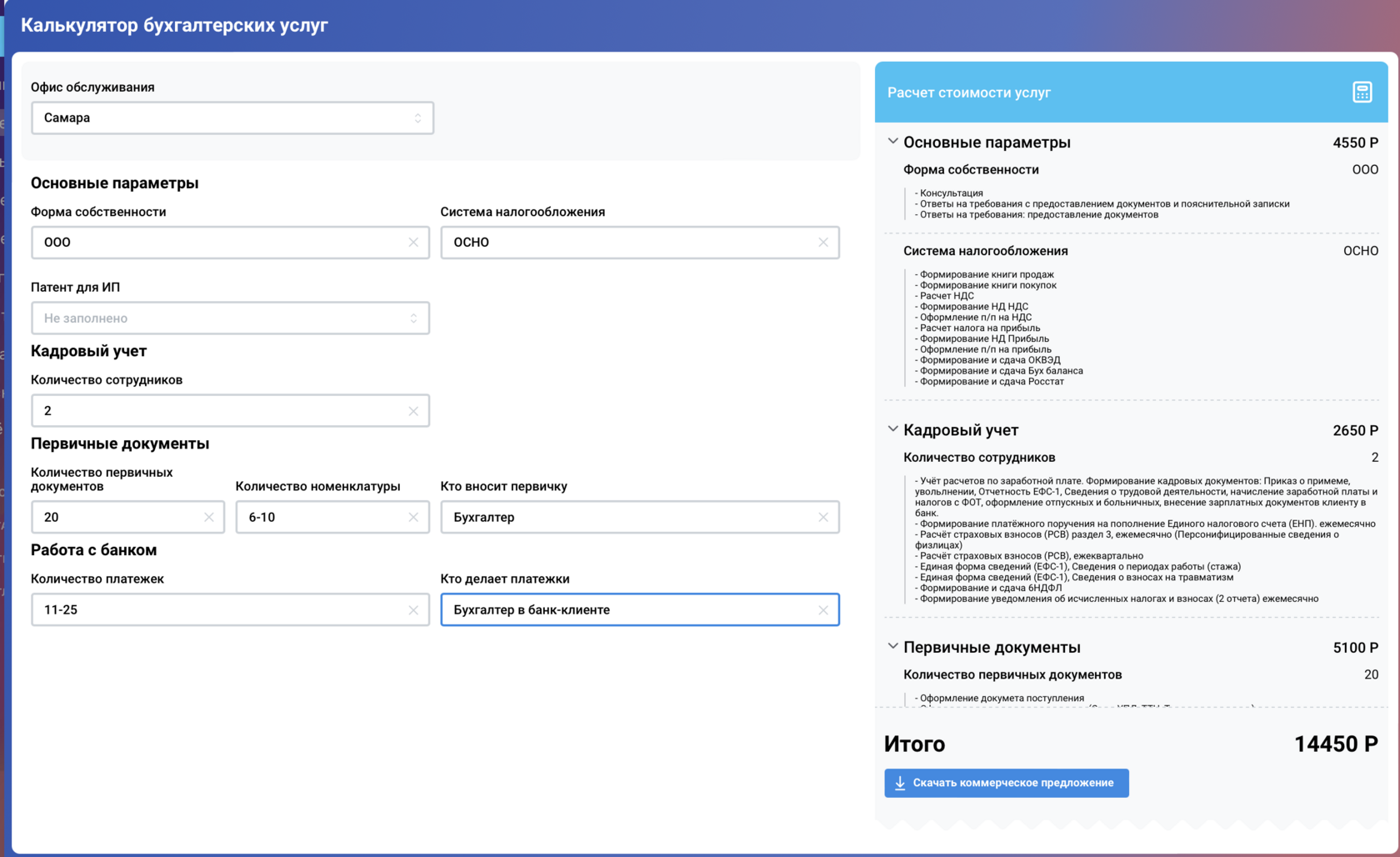 Уникальная методика расчета стоимости бухгалтерских услуг с карточками спецификации и возможностью скачивать КП для клиента - PROFкалькулятор